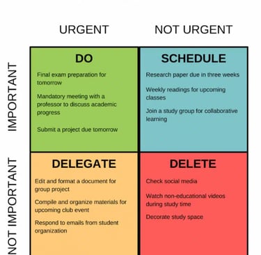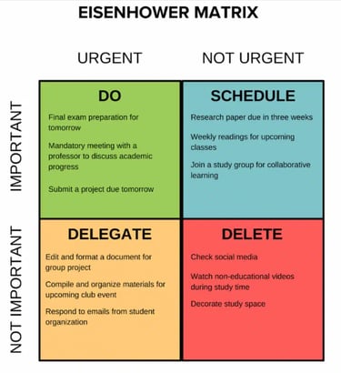 Prioritization: It is important to prioritize the most important or urgent tasks to use your time and energy effectively and avoid being sidetracked by time-wasting activities. The Eisenhower Matrix is a helpful tool for categorizing tasks in order of importance: